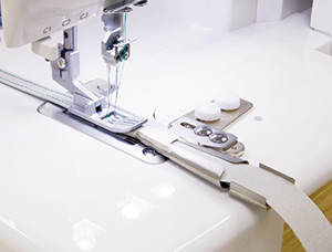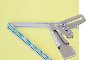 既製品のTシャツによく使われているバインダー仕上げが、一度縫うだけで簡単・綺麗に。キャミソールの肩ひもなどの紐(ひも)も作ることができます。テープを置くスタンド付き。