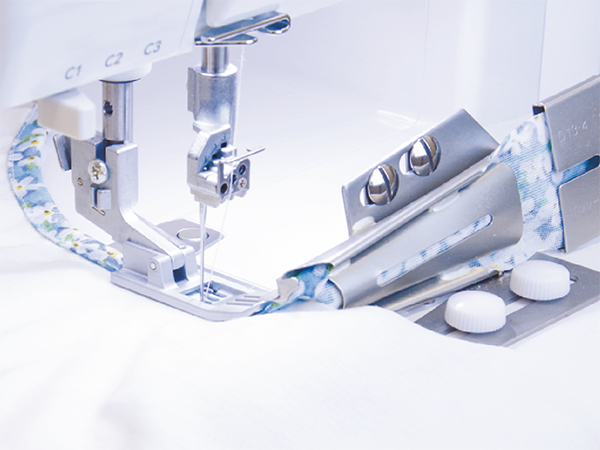 アイロンをかけなくても生地端を同じ幅で二つに折るため、長い距離をまっすぐ縫うときに、幅がぶれることなく綺麗に縫い上がります。