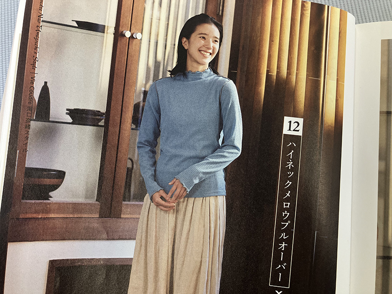 今回は太ウーリー糸のご紹介も兼ねて、「ロックミシンソーイングBOOK(ブティック社刊)」に掲載されている「ハイネックメロウプルオーバー」をつくってみました。