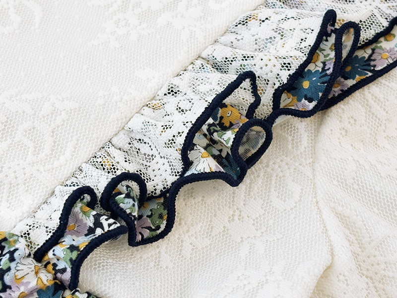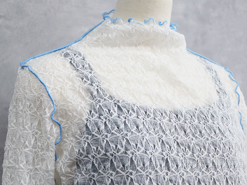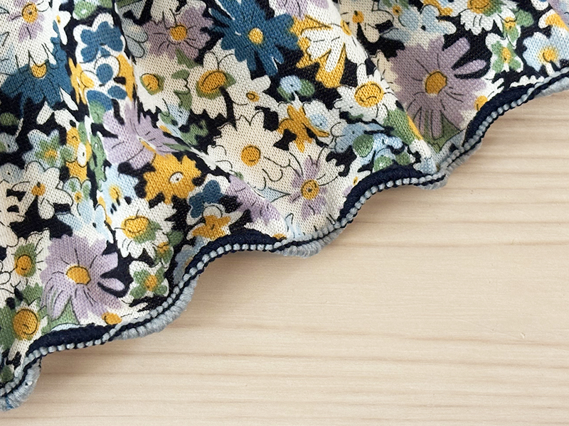 巻きロックの縫い目がさらに強調され、立体感があります。水色の糸が生地と合っていて可愛さもあり、爽やかな一着となりました。