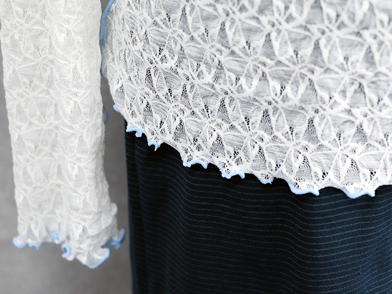 本とは雰囲気を変えて、ウーリー糸がより目立つ生地にしたいと思ったのでレースのニット生地にしました。ほど良い透け感があり、レースの花柄も甘くなりすぎず、良く伸びるので着心地も抜群です♪