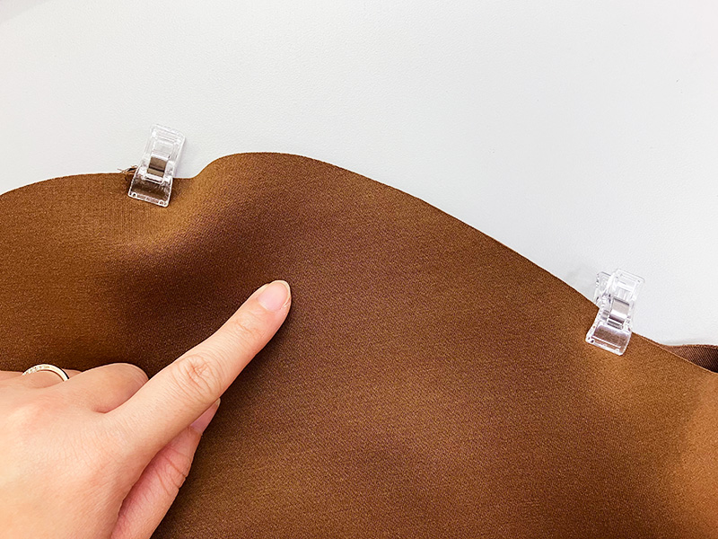 袖山部分は、カーブがきつくなっているので注意しましょう。こまめにクリップを止め、生地をピンと張りながら袖山がタックにならないように注意しましょう。