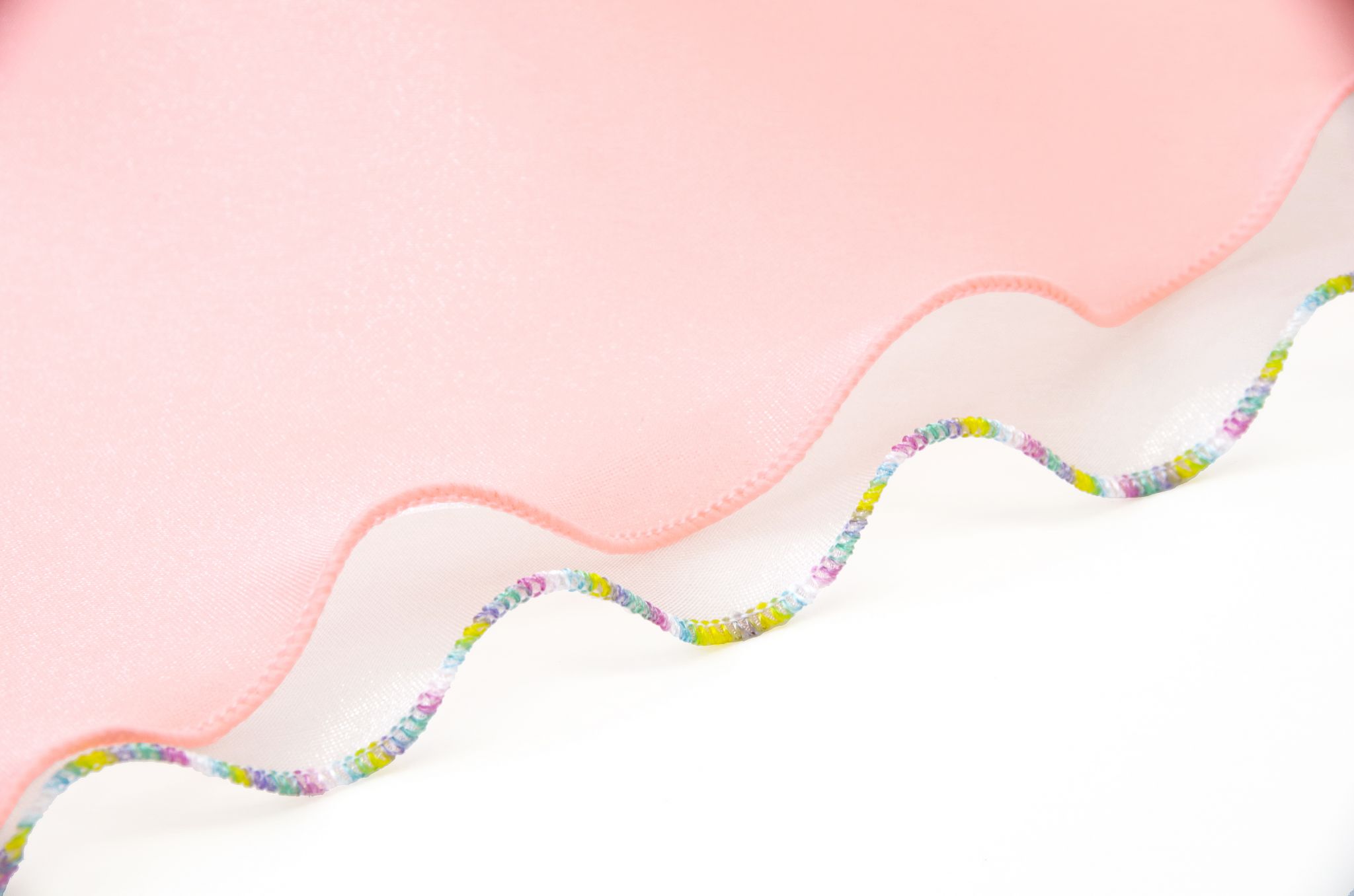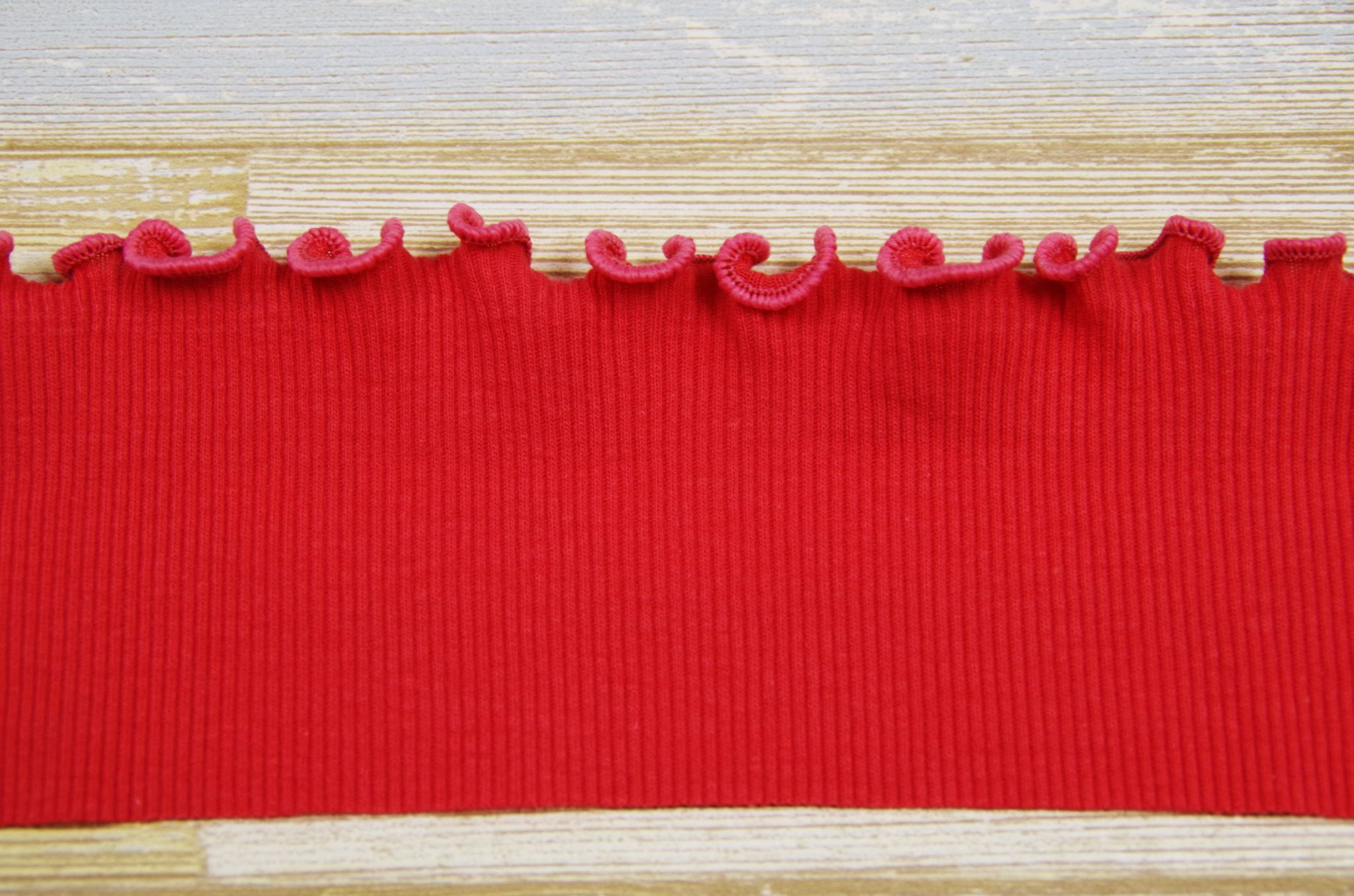 ウーリー糸の他に、段染めの飾り糸を使うとアクセントにもなり、可愛いです。巻きロックの縫い目を自然に波打つように仕上げたい場合は、生地をバイヤスにカットして縫ってみてくださいね。
