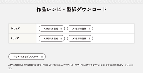 無料でダウンロードできる型紙には、ご家庭のプリンターで印刷&貼り合わせていただく基本のA4サイズと、大判印刷のA1サイズをご用意しています。