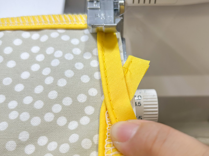 ②切り込みを開くように、パイピングコードを左に直角にしてから空環を出して縫いきりましょう。