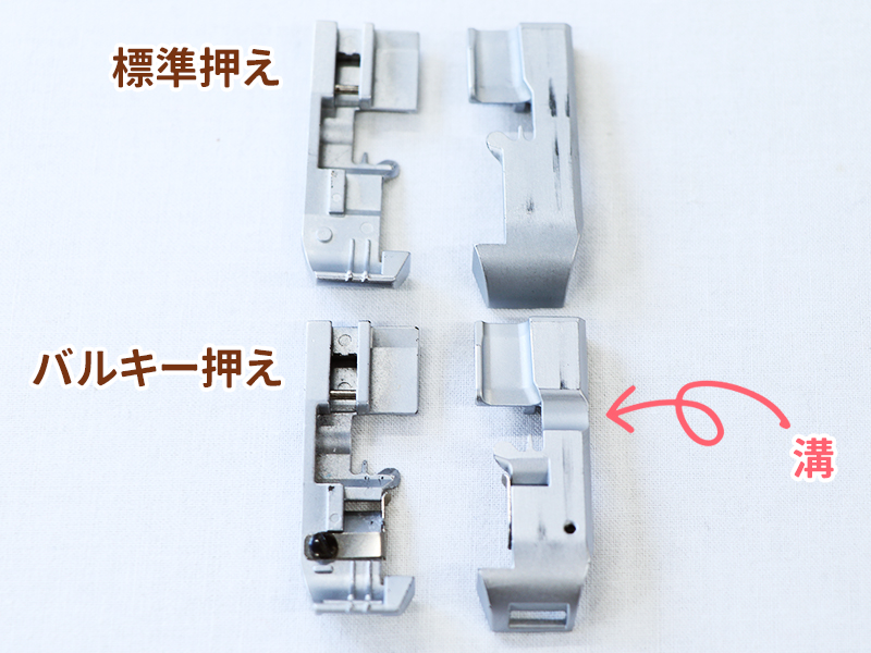 底部分にある小さな溝には生地をため込む役割があります。この溝がバルキー押えのポイント!この後詳しくご説明します。