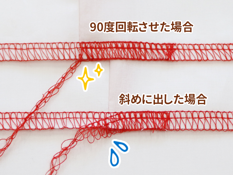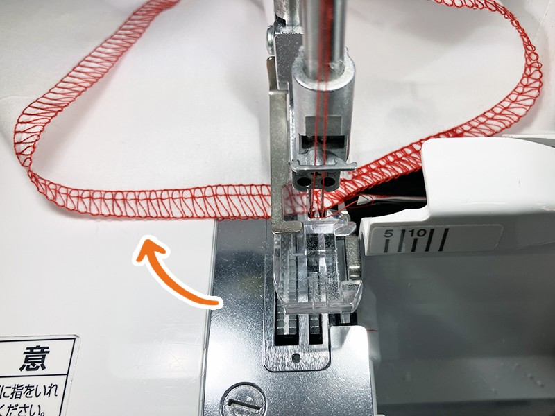 1.重ね縫いが終わったら針と押え金を上げ、生地を90度左に回転させ生地の無いところに針を下ろしましょう。