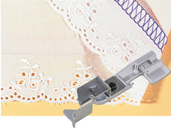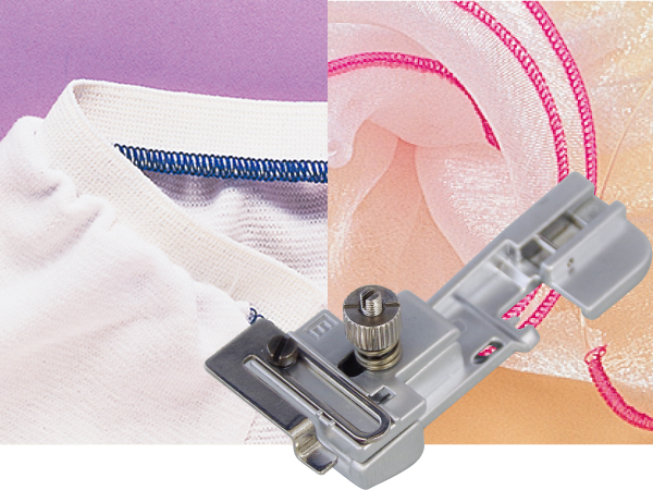 縁かがりと同時にゴムテープを簡単に縫い込むことができます。また、巻きロックに設定し、テグスやフリーウェーブを入れることもできます。