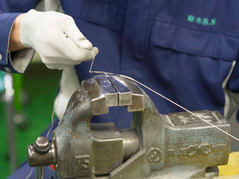 糸が通る穴のある部品、ルーパー。1mm程度の穴を磨く作業は機械では難しく、熟練した人の手で行われる。凧糸から手に伝わる抵抗感がツルッとした感触になれば磨きおわり。