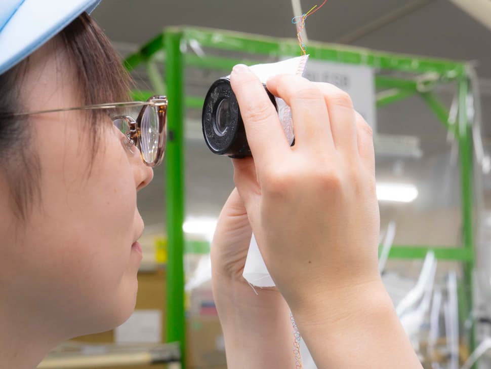 検査にはルーペ項目というものも。1台ごとに縫い目が綺麗に出ているか、目視でチェック。