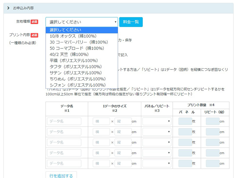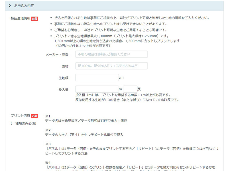 指定生地であれば生地種の選択、持込生地であれば用意している生地のメーカー名や品番などを入力していただき、届いたフォームの情報を基にプリント可否の判断やお見積もり額を出したりします。