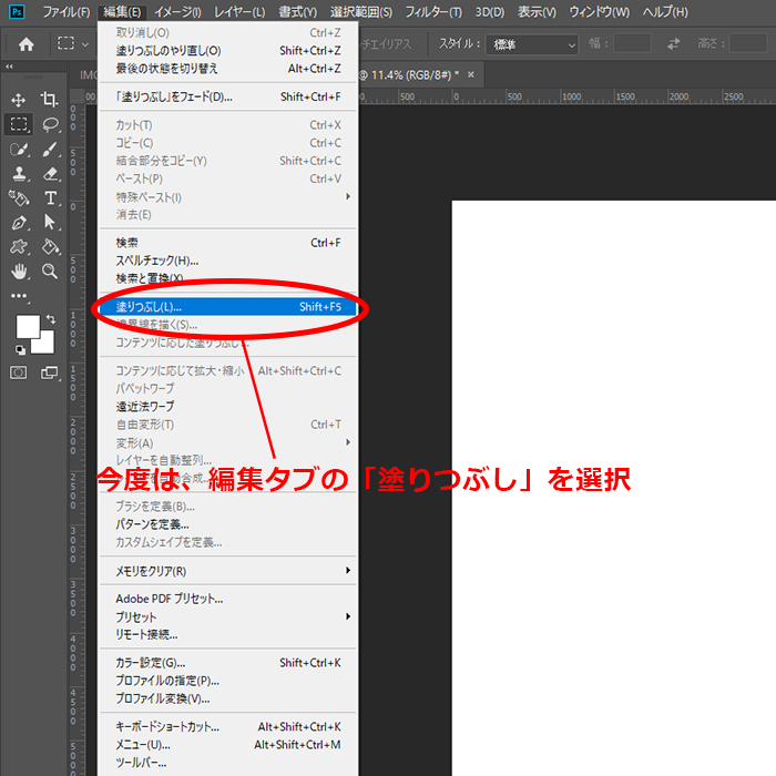 カンバスができたら、編集メニューの「塗りつぶし」コマンドを選択。