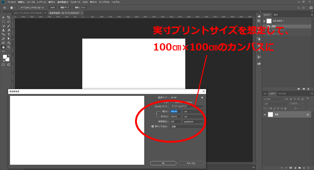 では1m×1mの布にプリントすることを想定して、フォトショップ上で100㎝×100㎝のカンバスを作ります。