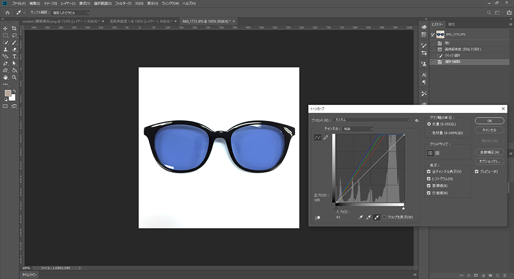 フォトショップに取り込んだら、トーンカーブという、光の加減をいじってサングラスの周りをきれいにしたり、画像全体にシャープをかけたり、画像自体をリサイズしていきます。