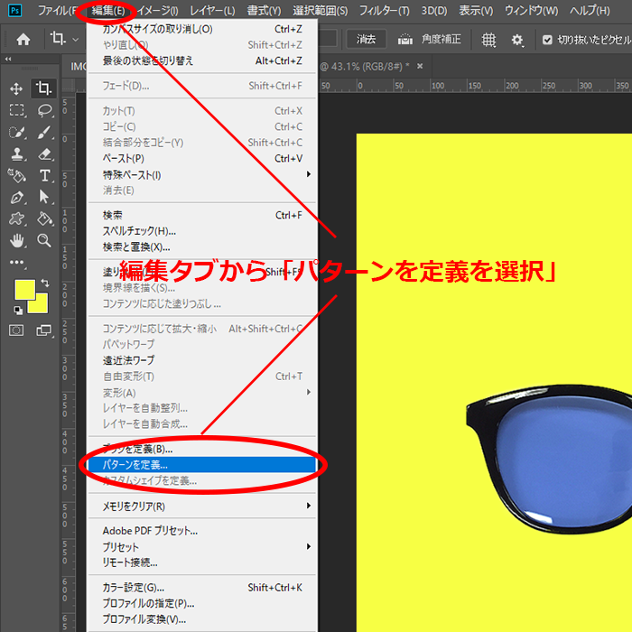 作った図柄の画像を開いたまま、編集メニューから、「パターンを定義」というコマンドを選択します。