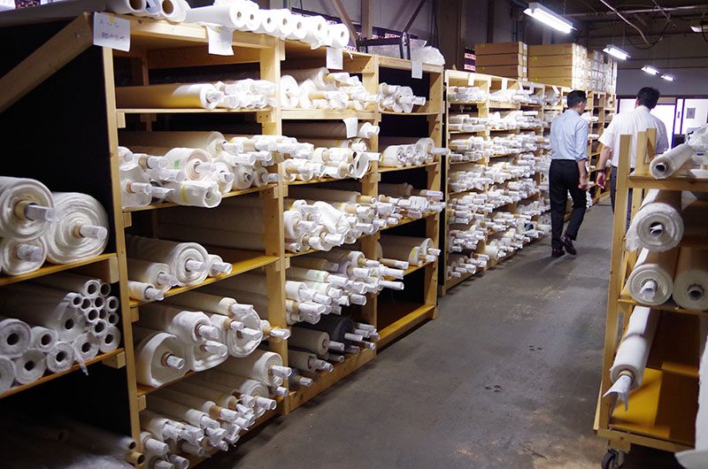 ここはプリントまでしばらく期間のある生地の保管場所になります。他にも到着した生地を置いておく場所や作業直前の生地を置いておく場所など、保管場所は点在しています。
