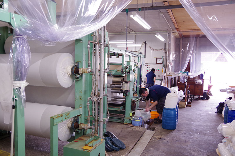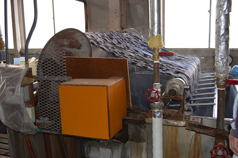 プリントの前にこんなに大掛かりな処理が必要なのか!と意外に思ったのですが、この機械の隣に、糊を乾燥させるための同じ規模の機械がもう一つあります。
