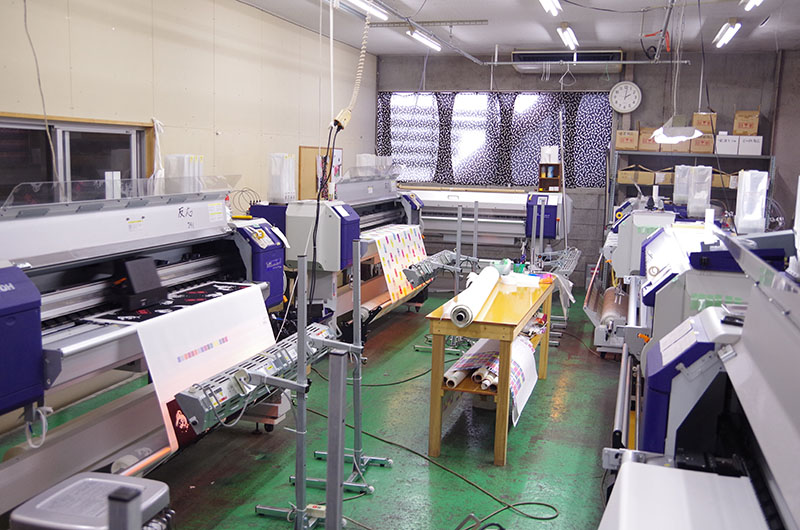 弊社では反応染料インクと分散染料インクでのダイレクトプリント2種類を取り扱っておりますが、工場では弊社以外の取引先のプリント分で、顔料インクも稼働しているようです。