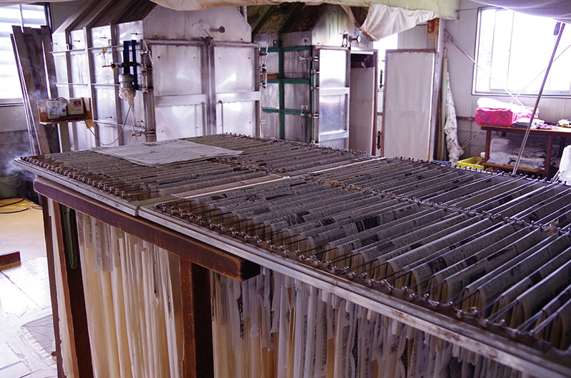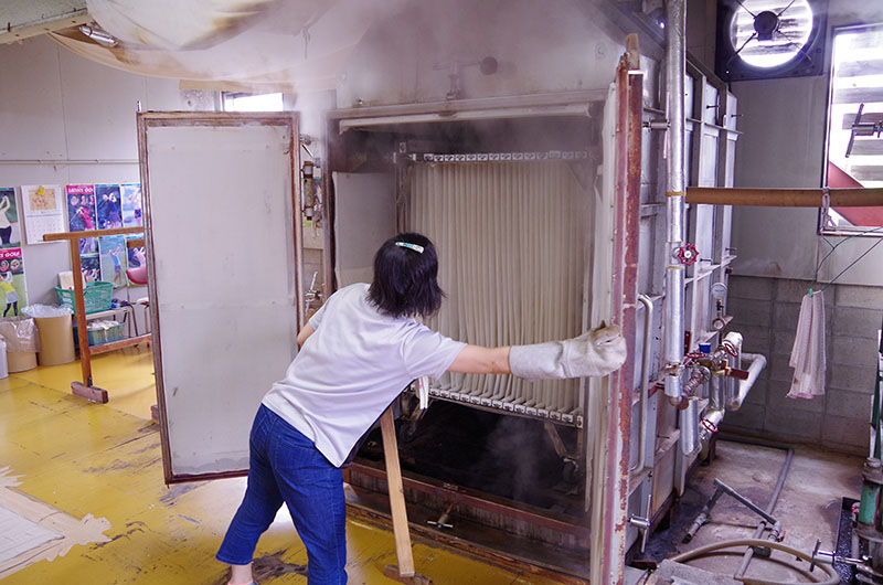 染料プリントは、接着剤で布にくっつける顔料や熱でインクを移染させる昇華転写プリントと違って、プリント後に蒸熱してインクを定着させます。蒸熱とは、読んで字のごとく蒸して熱を加えることです。