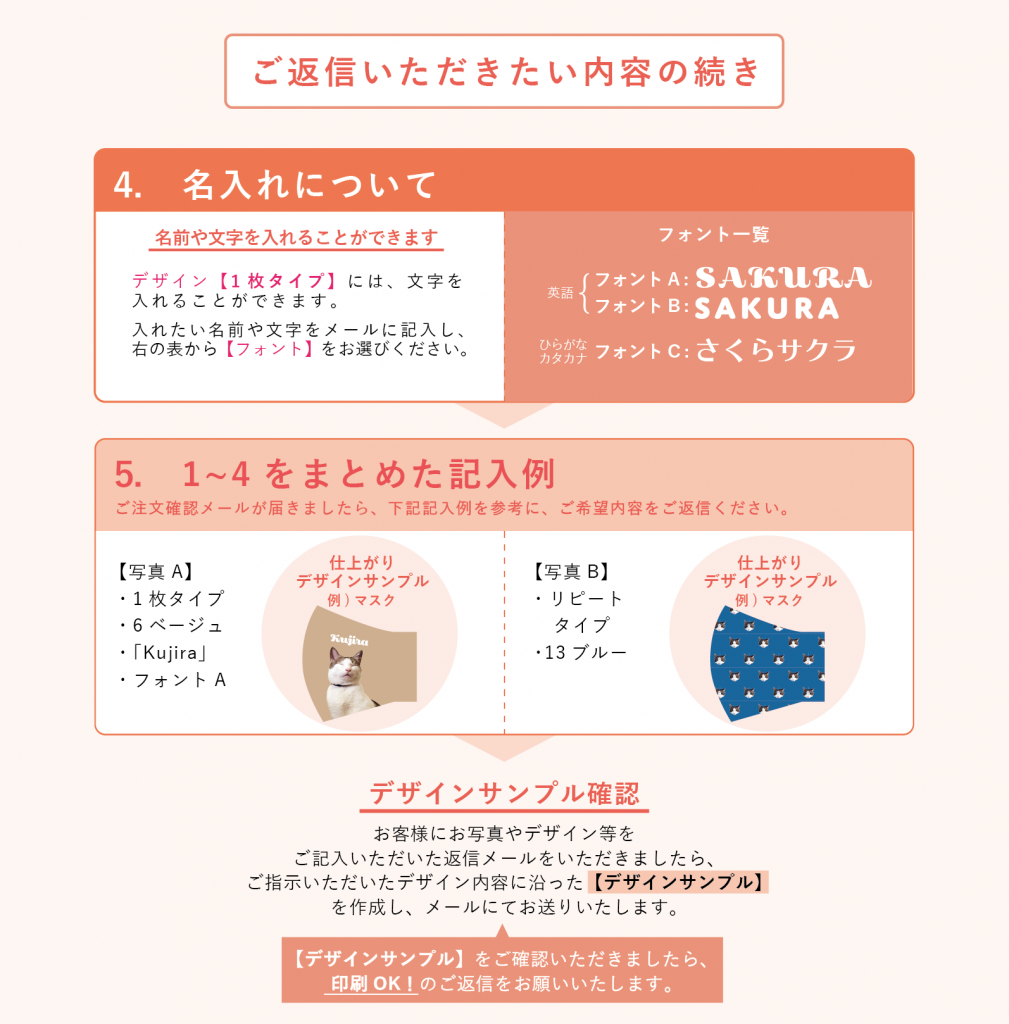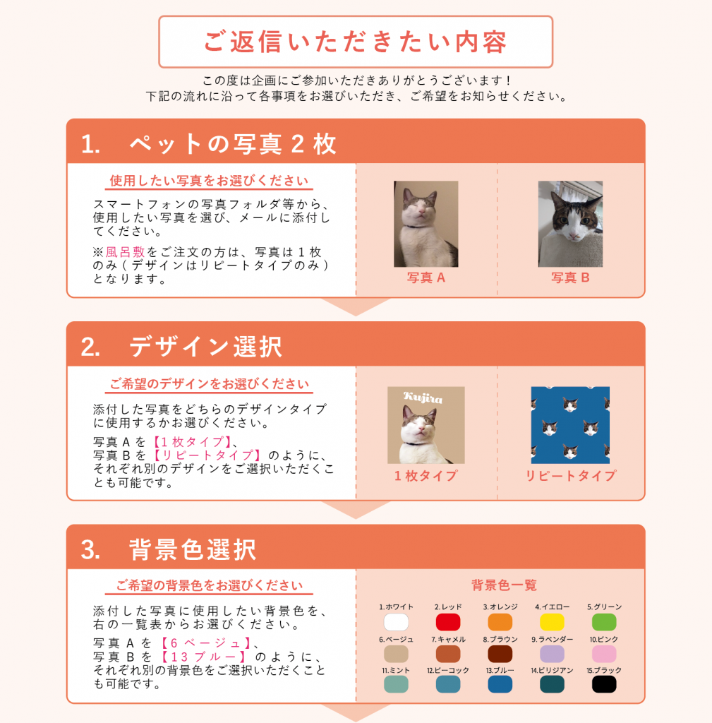 3. 「ペット写真グッズのご注文確認」メールを受信したら、お好きなペットの写真を添付し、背景色、名入れ等を指定して返信してください。(※ご返信いただく内容は、下記の画像を参考にしてください)