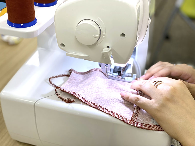 耳掛けひもの部分は、生地が重なって分厚くなり、縫いにくいです。