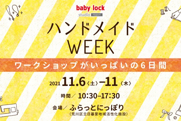 【ハンドメイドWEEK】ワークショップ一覧公開&申込受付開始のお知らせハンドメイドWEEK ー ワークショップがいっぱいの6日間 ー気軽に楽しめるハンドメイド体験から本格的な作品づくりまで“ワークショップがいっぱい” の6日間です。多くの方にご参加いただける多数のワークショップを開催しますベビーロック・スタジオ【日暮里】では、11月6日(土)~11月11日(水)の6日間、ハンドメイドWEEK を開催いたします。ハンドメイドWEEK では、15種類以上のワークショップを予定。ベビーロックのソーイングアドバイザーの指導を受けながら、ミシンを使ってお洋服を縫う講座や、誰でも簡単にチャレンジできる、レザーを使ったキーリングや、異素材パーツのアクセサリー作りの体験講座を受けていただけます。”ものづくり初心者”や”男性参加者”も大歓迎普段からベビーロックミシ…