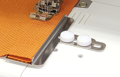 カバーステッチミシンに付属する生地ガイドと裾引きガイドを使うと、裾上げをする際に便利です。