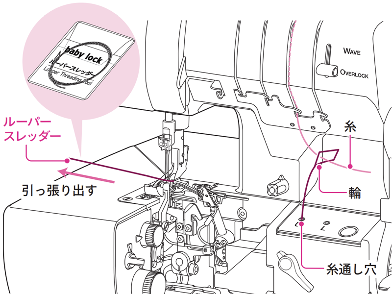 『ルーパースレッダー』の輪に、通したい糸を数cm入れ、「糸通し穴」に差し込んで、ルーパーの先端から引っ張り出します。