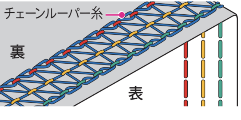 表の縫い目が直線で、裏の縫い目が鎖状(ループ)になっている。