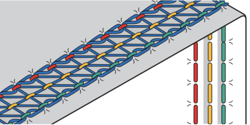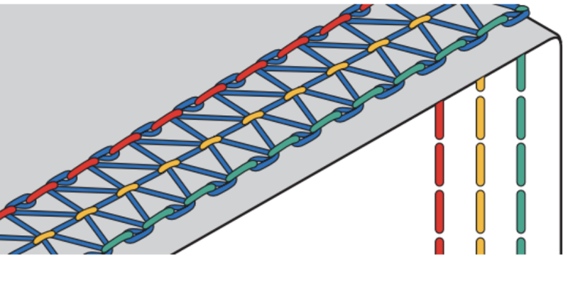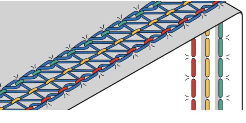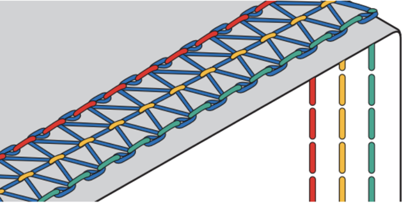 カバーステッチミシンの縫い目は、表が直線で、裏が環状になっている縫い目です。