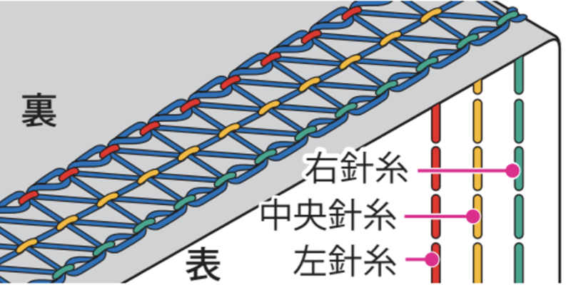 表の縫い目が3本の直線で、裏の縫い目は鎖状(ループ)になっている。
