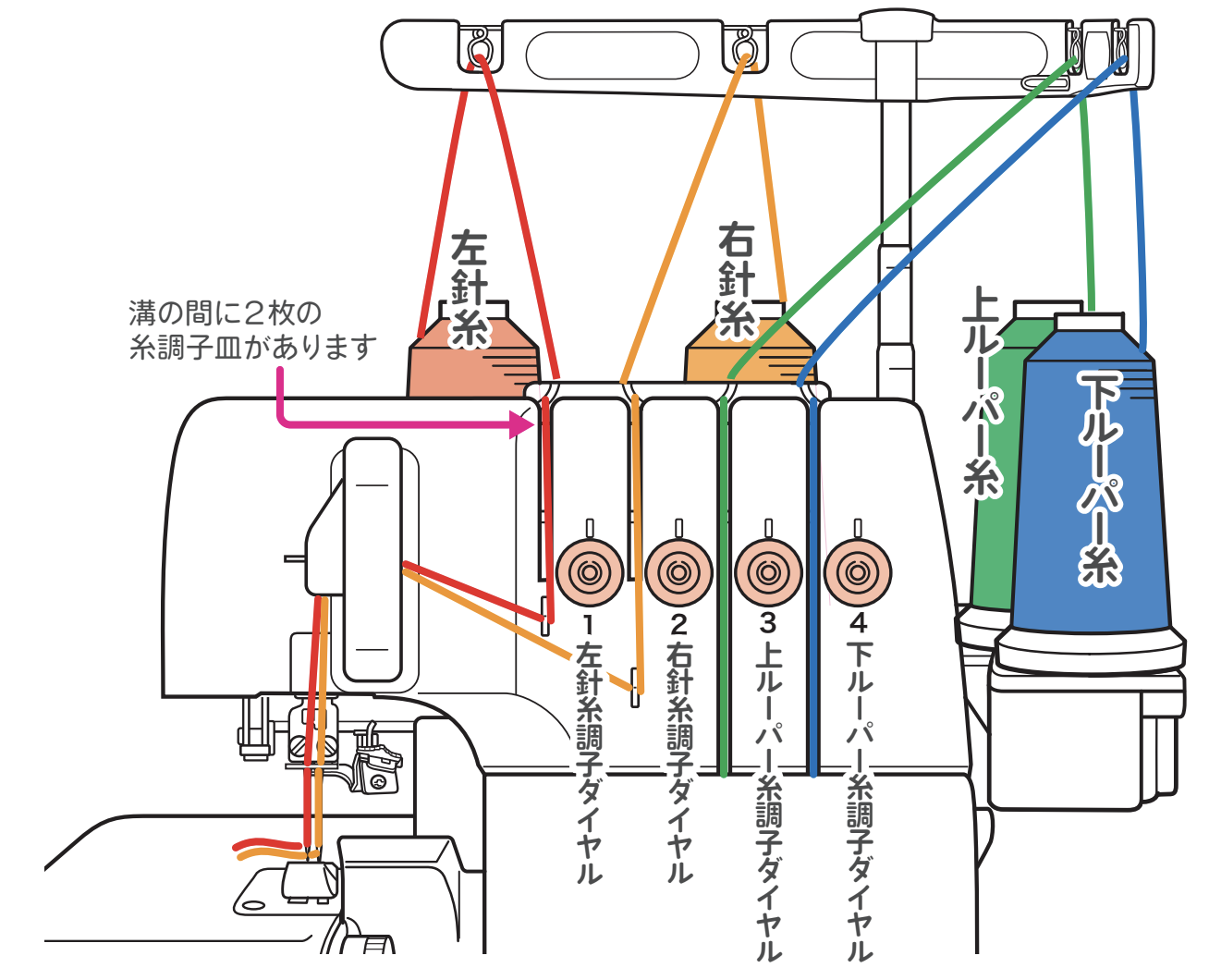 糸調子ダイヤルをいくら回しても糸調子がとれない場合は、糸調子皿から糸が、 はずれていることがあります。糸がはずれるときれいな縫い目になりません。