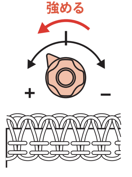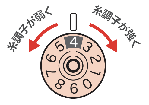 ダイヤルを数字が小さい方へ回すと糸調子は弱く、数字が大きい方へ回すと糸調子は強くなる。