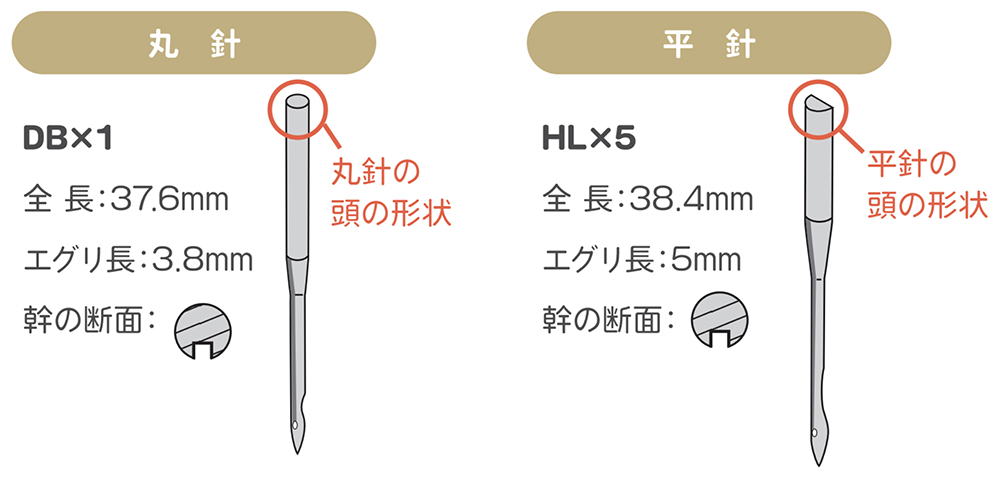 ※HL×5は職業用ミシン用の平針で、家庭用ミシンの標準針であるHA×1に比べて針の強度向上効果があります。