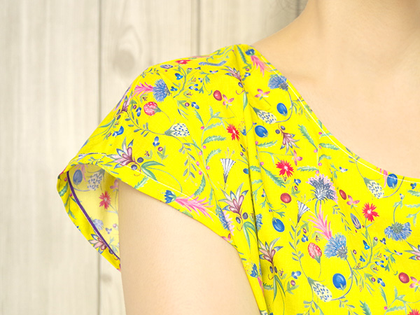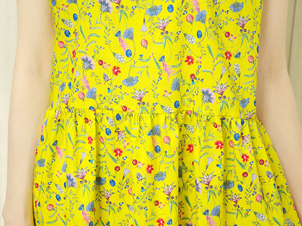 リバティローンの<Temptation Meadow>を使ったフレンチスリーブのシンプルなワンピース。
