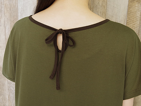 衿ぐりは後ろのリボン結びがポイントの四つ折バインダー仕上げ。スカートの共布を使い、全体の印象を引き締めています。