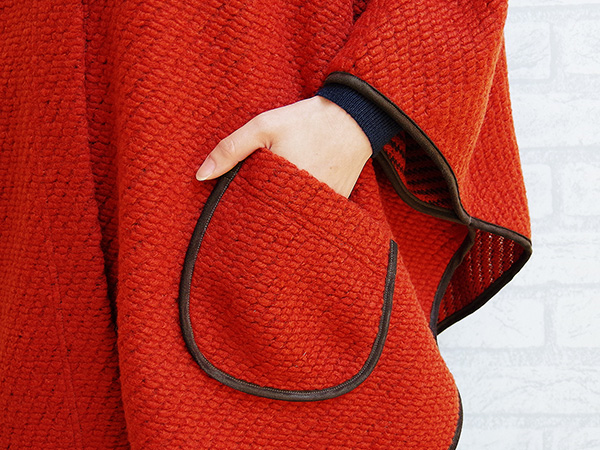 鮮やかなオレンジのニットツイードに、デザインをピリッと引き締めるブラウンのスエードで縁どりをした、異素材の組み合わせがオシャレなケープ。