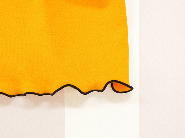 肩のフリルや袖口、裾はバイカラーの変形巻きロックでフリフリに仕上げました。