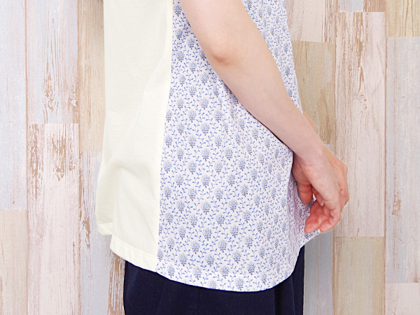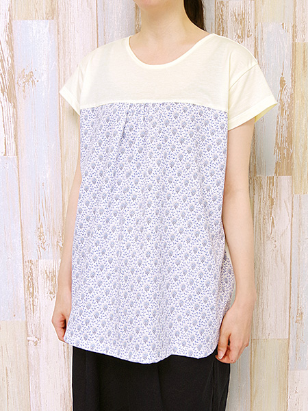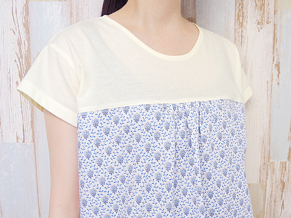 ニットにアイボリーの天竺、布帛にはソレイアードのシーチングを使った、切換デザインが素敵なプルオーバー。