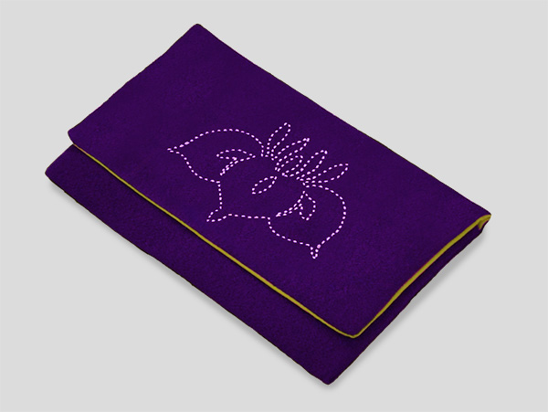 ちりめん生地に接着芯を貼ってからステッチしています。簡単な縫い合わせならSashikoミシンだけで作品が仕上がります。表地、裏地、ステッチの色は冠婚葬祭にあわせて選んでください。