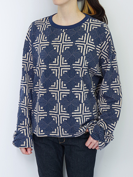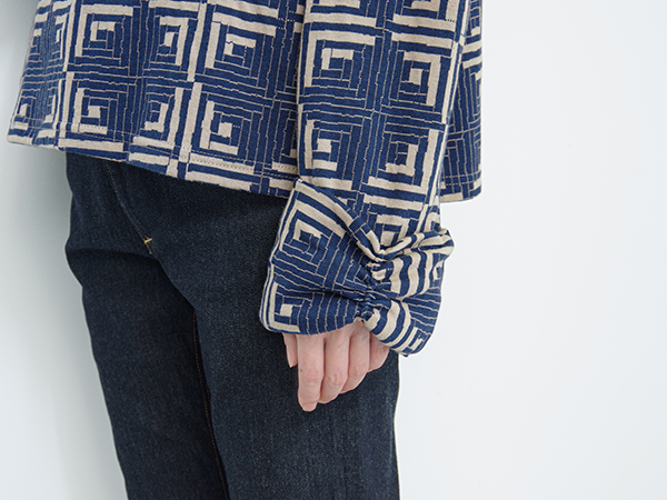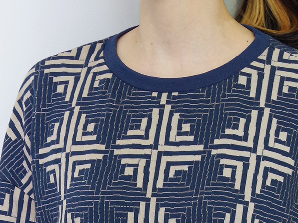 衿ぐりは共布ではなくネイビーのスパンフライスニットを使用。