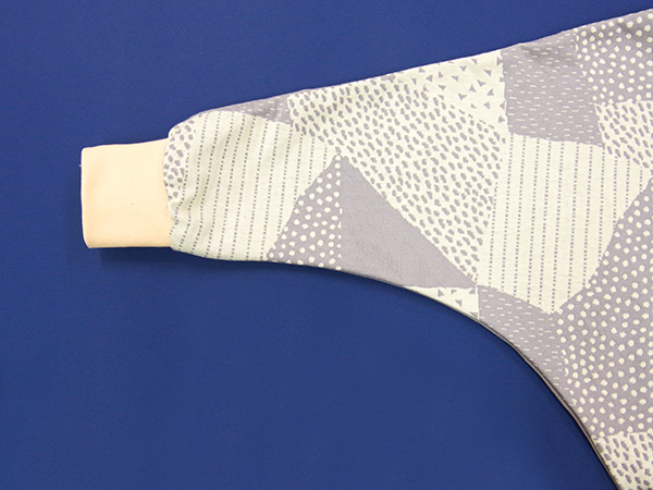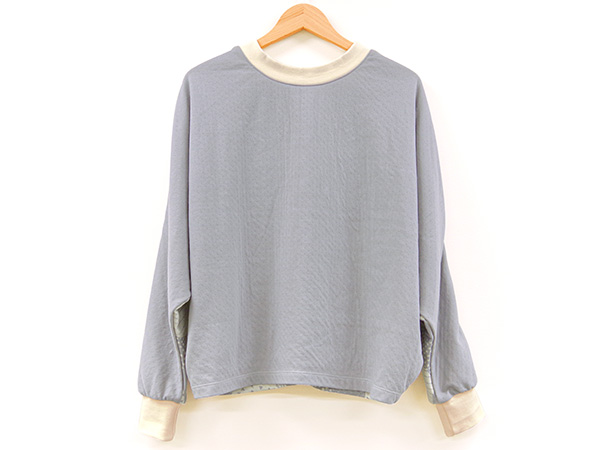 後身頃を無地にしたり、衿ぐりと袖口のアイボリーのリブがポイントになっています。