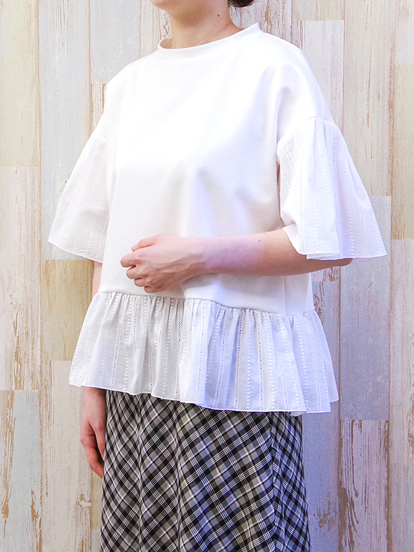 ストライプ状のローンレース地の袖と裾フリルが涼しげなプルオーバー。