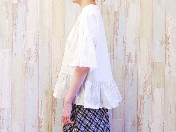 ストライプ状のローンレース地の袖と裾フリルが涼しげなプルオーバー。