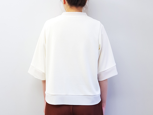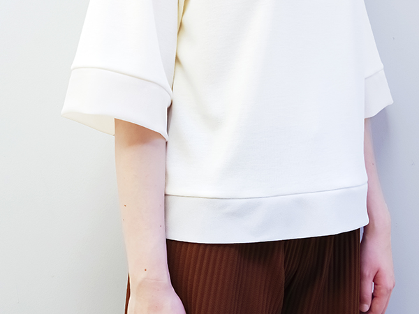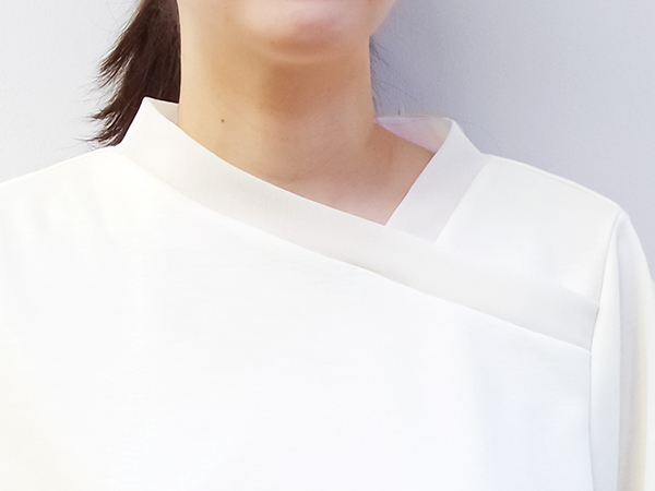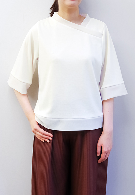 アシンメトリーの衿ぐりが印象的なカットソー。