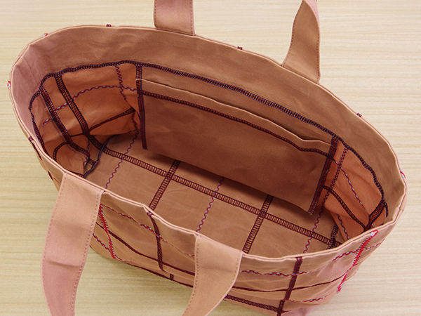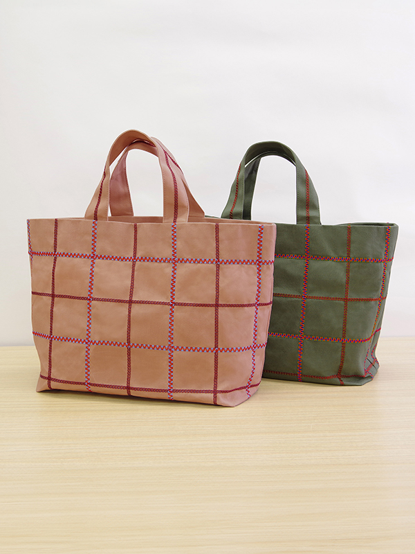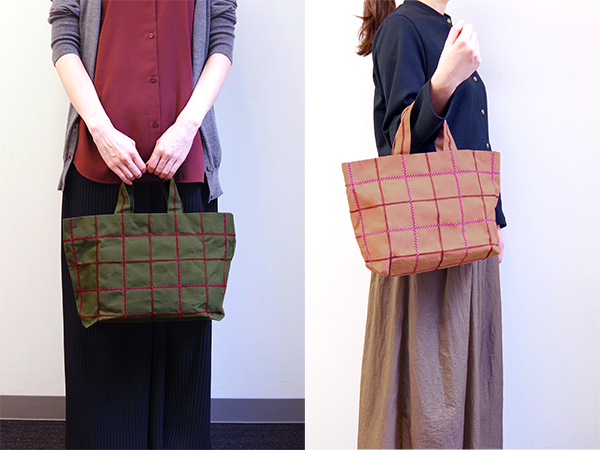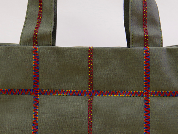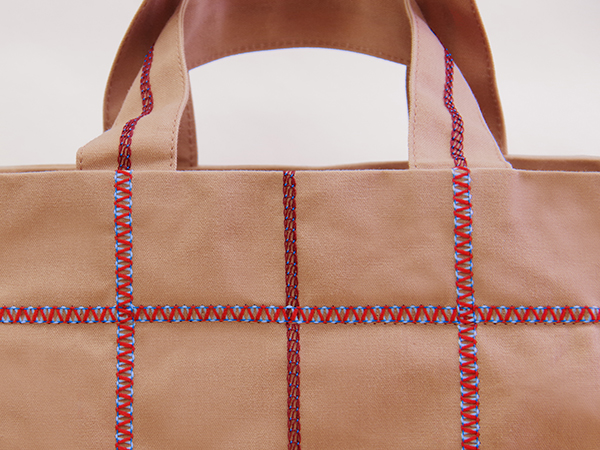 薄手の帆布生地に格子状のクリエイティブカバーステッチをほどこしたオリジナルテキスタイルでトートバッグを作りました。