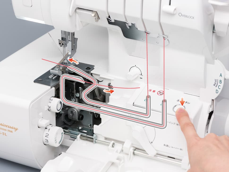 めんどうな糸通しを、空気の力で解決。最適な空気圧で糸を送り、パイプ内をスムーズに通す独自設計。ルーパーに糸を通すための「つなぐ・切り離す」構造の開発には幾度もの試行錯誤を重ねた。手間を減らし、もっと気軽にロックミシンを使えるように。