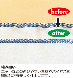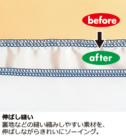 レバーひとつで伸ばし縫い、縮み縫いがラクラク。伸縮素材をツレ、シワのない美しいシルエットに仕上げます。