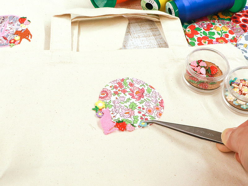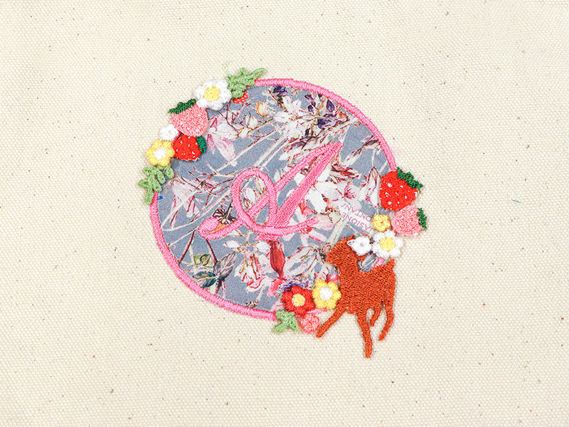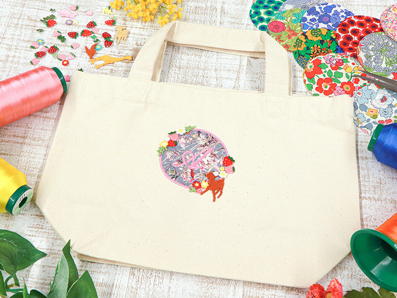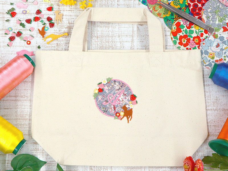 お好みのリバティを選んで、刺しゅうミシンでイニシャルを入れた後に、可愛い刺しゅうモチーフを貼り付けて、あなただけのオリジナルアイテムミニトートバッグを作ってみませんか。