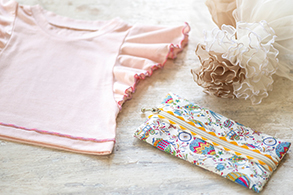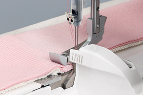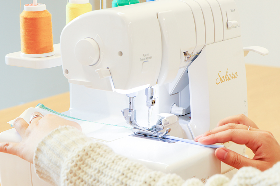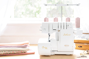 布端がほつれないようにする かがり縫い や、ニット生地をつかったカットソーを縫製するためのオーバーロック専用ミシンです。巻きロックやウェーブロック機能をつかって、布端や縫い合わせ部分に装飾的な処理を施すことができます。